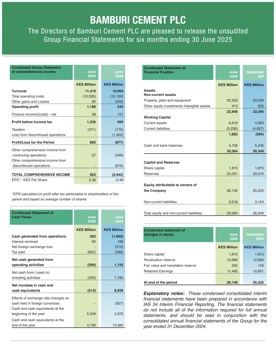 The Directors of Bamburi Cement PLC are pleased to release the unaudited Group Financial Statements FY 2025 for the six months ending 30 June 2025